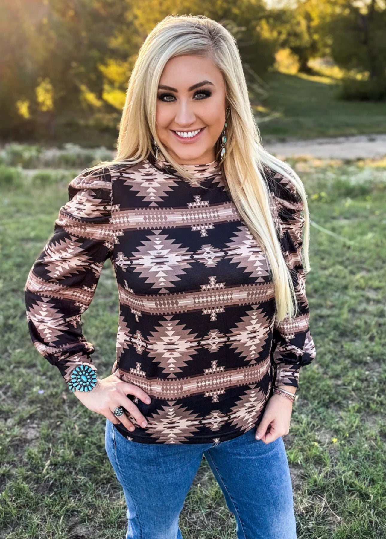 Elevate your wardrobe with the Golden Arroyo Top, featuring a striking black and tan Aztec pattern that brings bold, stylish flair to any outfit. Designed for effortless pairing, this top adds a unique cultural touch while keeping you comfortable and confident all day long. Perfect for those who want to stand out with a blend of classic and contemporary style.