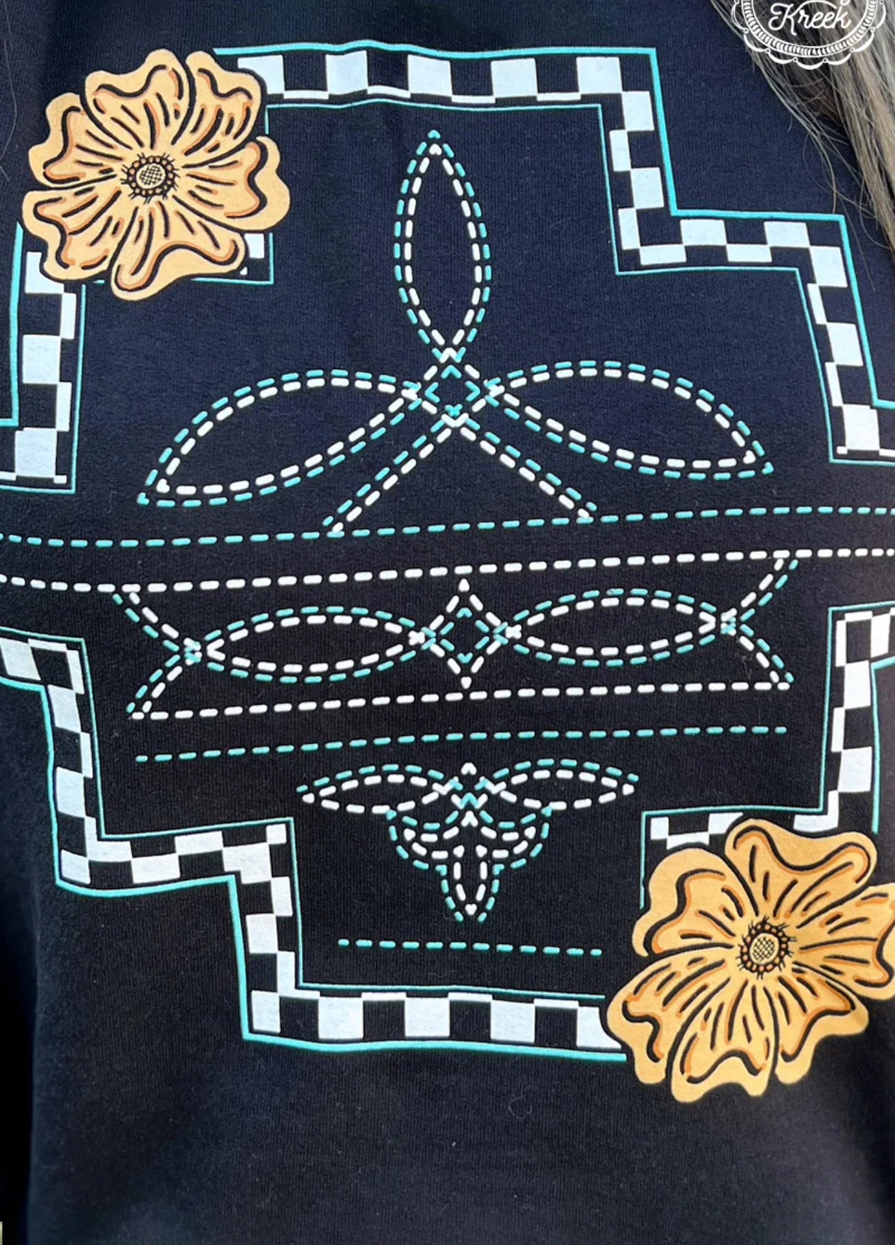 Feel trendy and chic with our Little Country Little Hood Pullover! Featuring a checked aztec graphic, viral bootstitch, and two tooled leather flowers, this Gildan pullover is the perfect balance of style and comfort. Get ready to turn heads with this effortlessly cool piece!