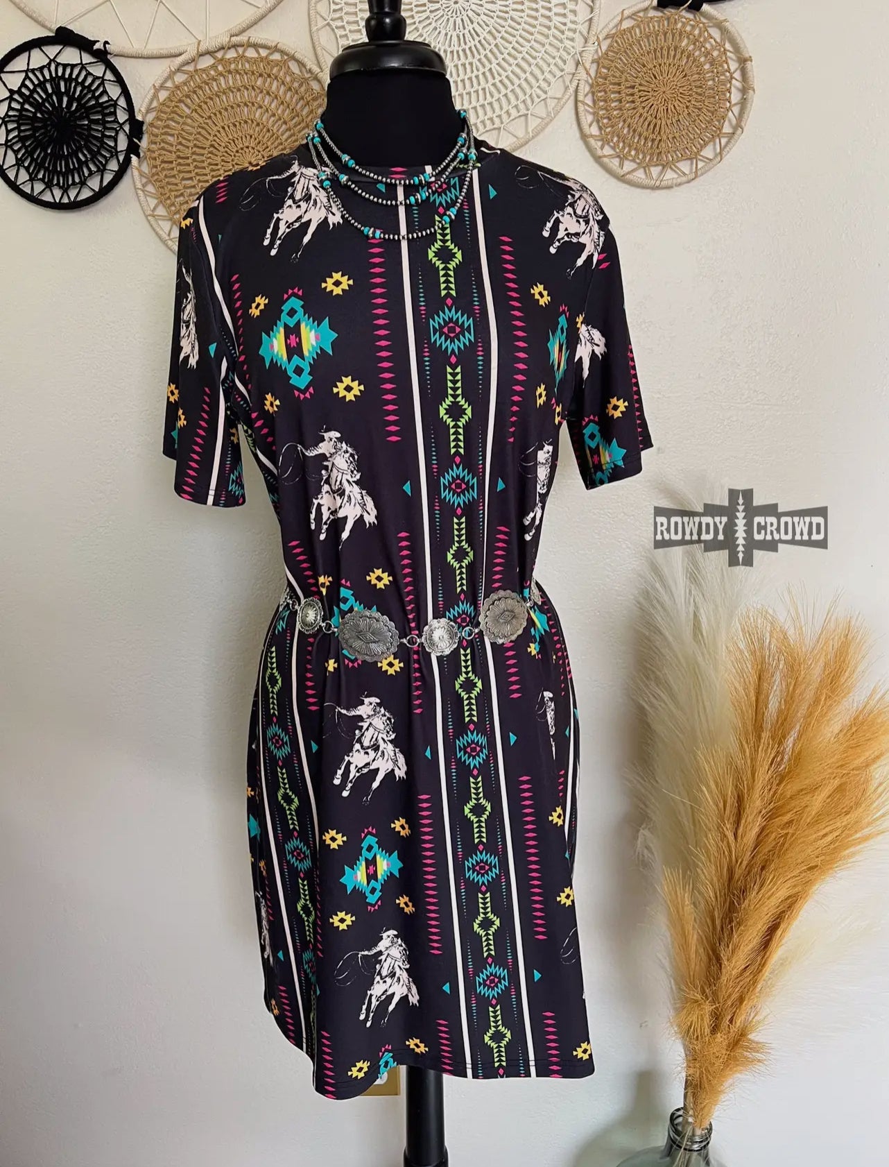 Elevate your style with our Rope & Ride Dress! The sleek and silky fabric will make you feel confident and comfortable. The perfect length and unique aztec and bronc rider print make it suitable for any occasion.
