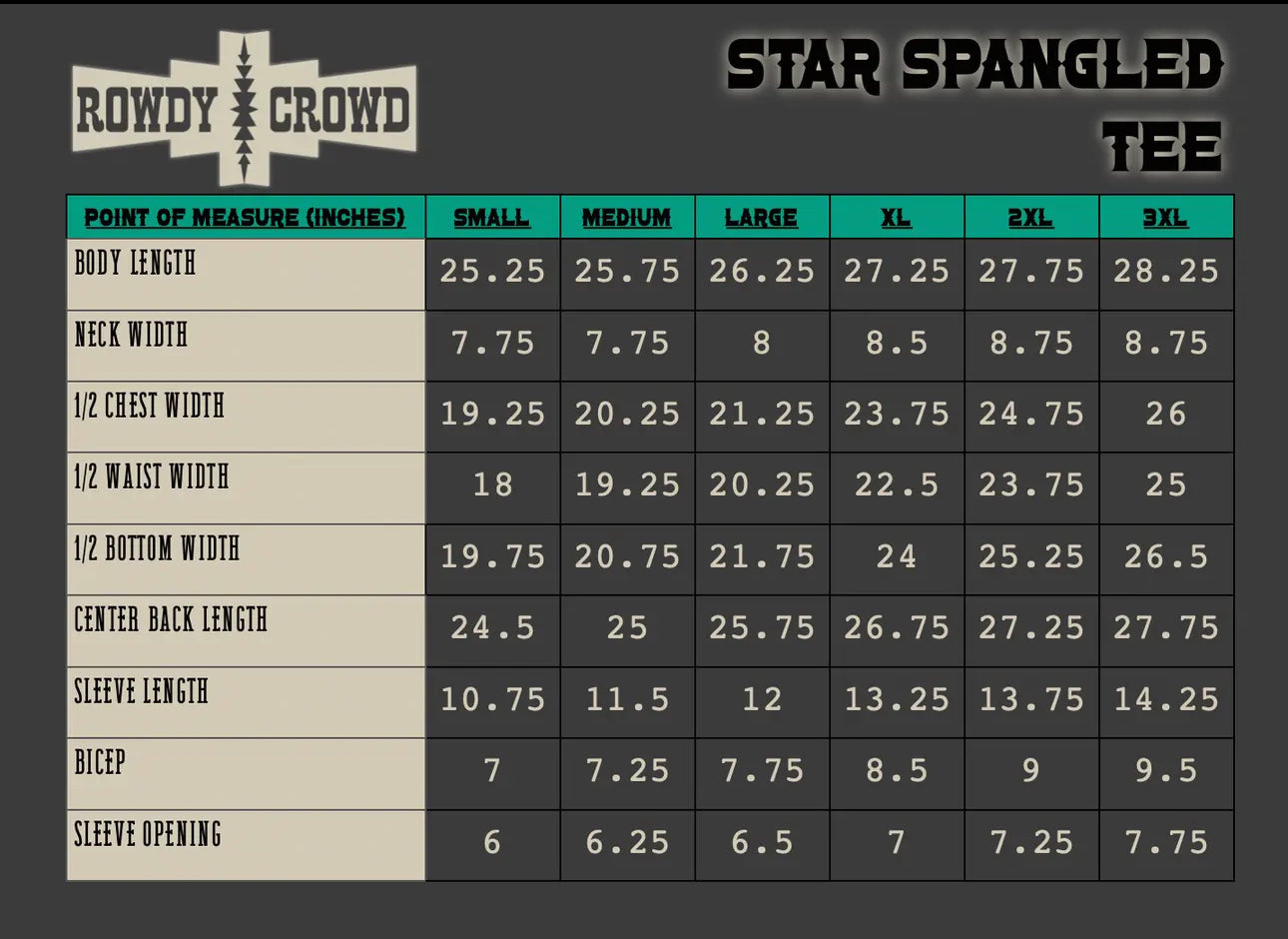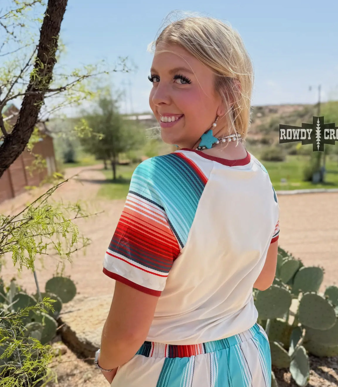 Its sure to be a party in the USA with our Star Spangled Tee! Featuring a soft, lightweight, cream tee with a patriotic serape print on the sleeves and front left pocket, topped with a red neckline. Its the best way to show your pride for the South West and the USA. (Psst--It matches our Wild and Free Shorts perfectly)