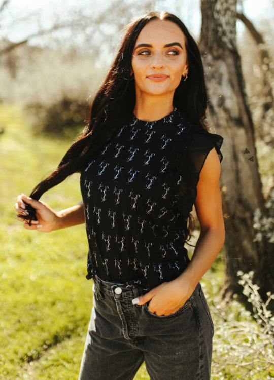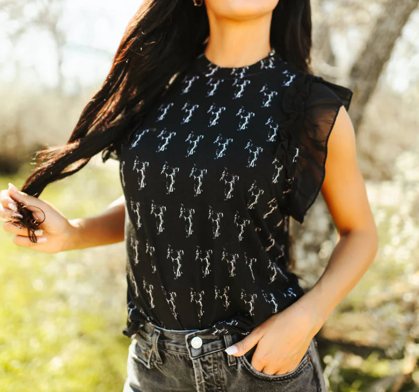 this mock neck tank has a simple saddle pattern with ruffle details on the shoulders. PERFECT for summer rodeos.