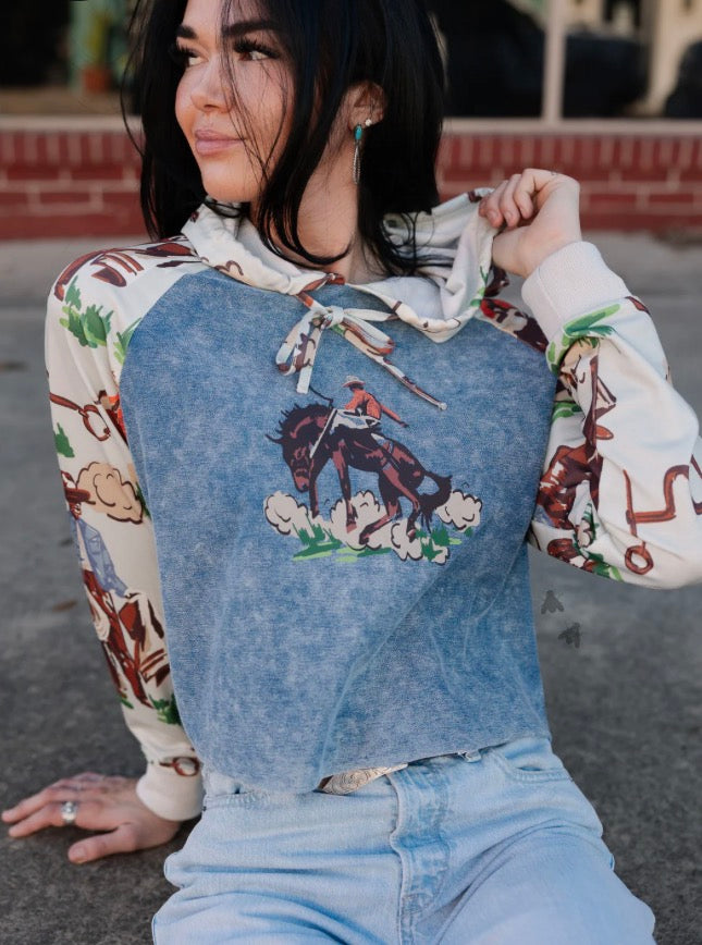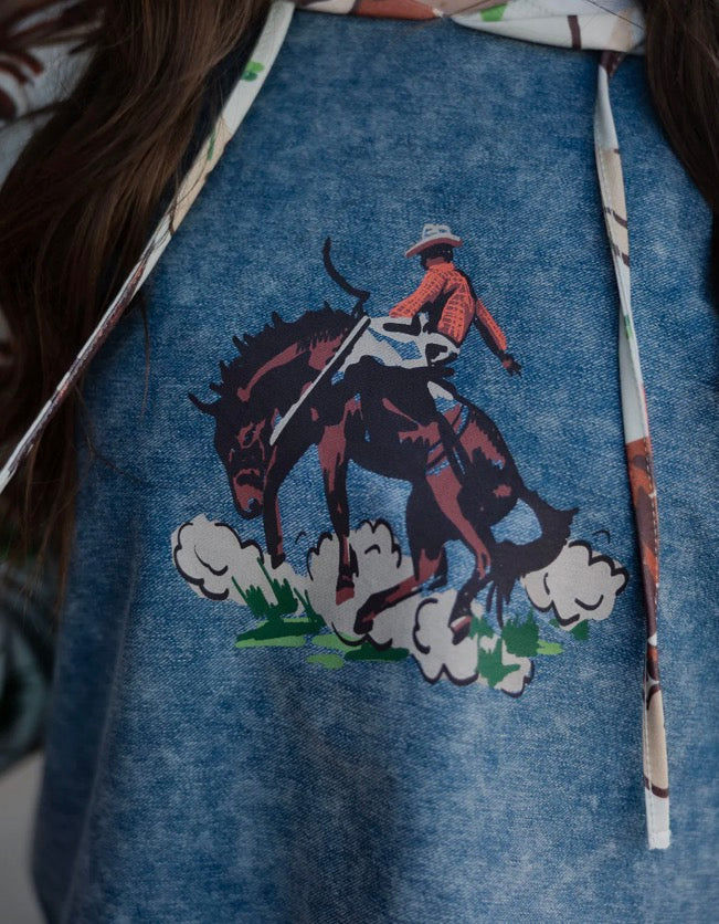 this PATTERN has been a FAN FAVE lately... and we get it cause it's our FAVE two. this one is giving vintage ranch vibes and peep the denim cuff detail - NOT DENIM but denim effect on sweatshirt material.