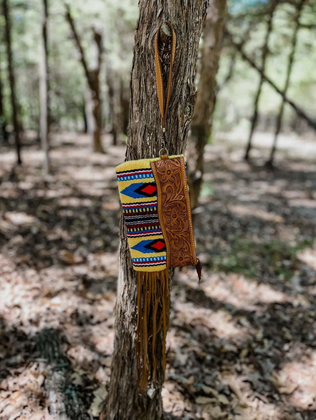 Western Aztec Tooled Leather Tassel Wristlet Purse